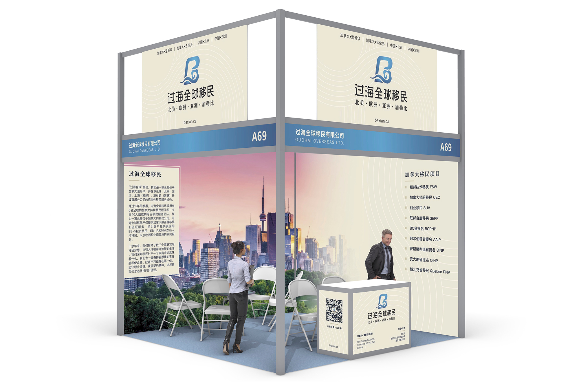 Check out our work for GuoHai International, a subsidiary of Canada-based Baxian Consulting Ltd., specializing in immigration consulting services. We’ve designed eye-catching trade show materials and realistic 3D visualization mockups to help them stand out at industry events. Our designs effectively showcase their services, making it easier to connect with potential clients and partners. Explore our portfolio to see how our designs create a strong and professional presence that leaves a lasting impression.